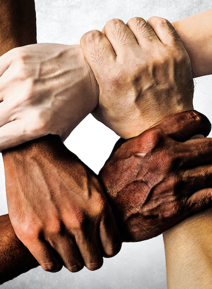 multiracial group with black african American Caucasian and Asian hands holding each other wrist in tolerance unity love and anti racism concept isolated on grunge background