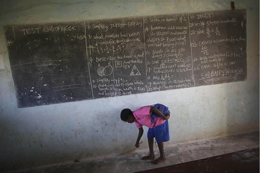 Dan Opiding cleans the classroom before the day of school begins in Ogongora village, Uganda. When he gets to school each day, Dan’s first task is to help clean its yard and his classroom.