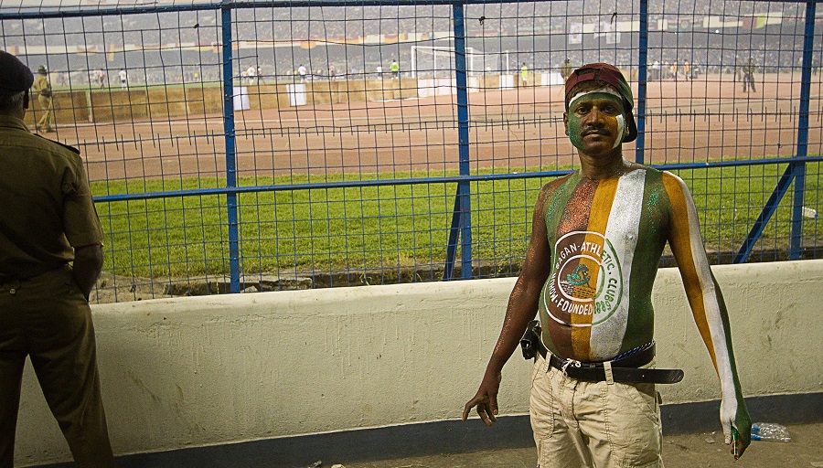 A Mohun Bagan supporter at his team’s 299th meeting with East Bengal in November 2011. Mohun Bagan won 1-0 thanks to a first-half penalty goal by their Nigerian striker Odafa Onyeka Okolie.
