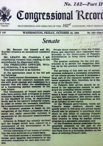 Soon after, the deed was done. The Senate resolution was agreed to. It made its way through the U.S. legislative process and had a very fruitful diplomatic impact. The U.S. government, keen on providing Poland with support, could now argue vis-à-vis other western nations that the Congress was pressing them to create a framework for debt forgiveness for Poland.