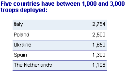 There are only five countries, excluding the United States and Britain, which have contributed more than 1,000 troops each — Italy (2,754), Poland (2,500), Ukraine (1,650), Spain (1,300) and the Netherlands (1,198). |