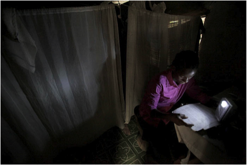 Mercy does her homework by the light of a solar lamp. Electricity has been restored in only some parts of Monrovia.