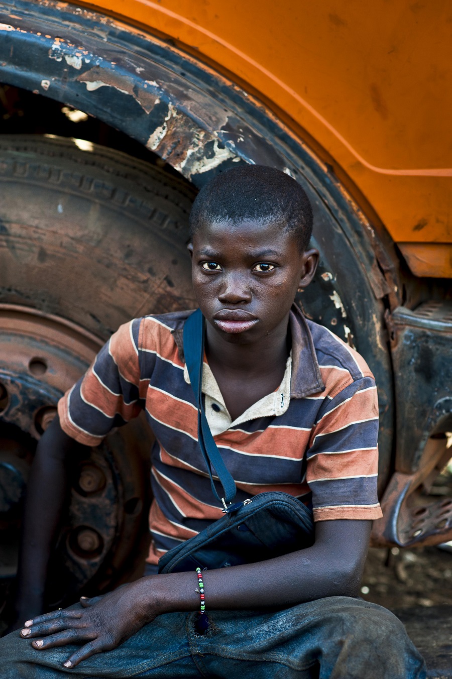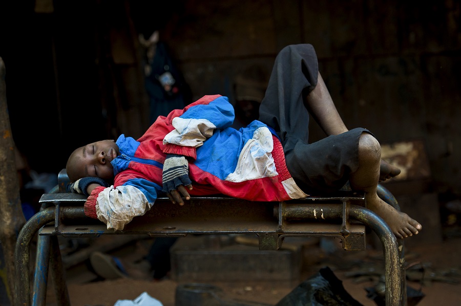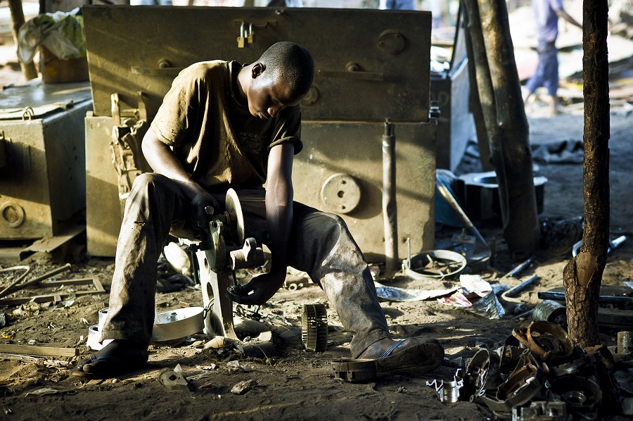 Mahamadou, 17, grinds metal parts that have just been molded. Every day he works from 7 AM to 6 PM. He never went to school and, like more than seven out of ten Malians aged 15 or older, is illiterate.