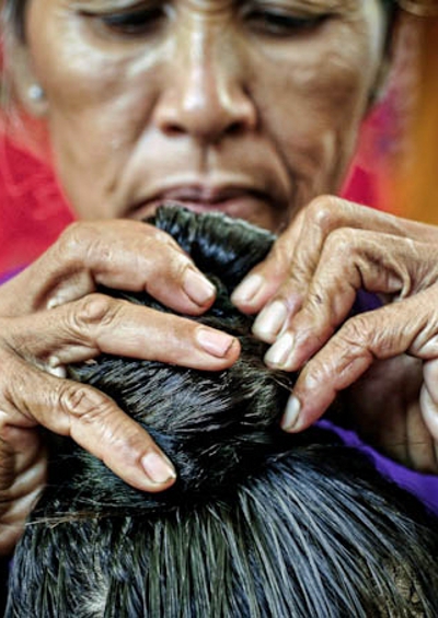 Queuing in line, anxious and excited, they step into the main tent where the priests are sitting in a circle. The senior priest solemnly plays the main role. He puts his hand on each girl’s head, starts praying and then uses scissors to cut off a little bit of her hair.