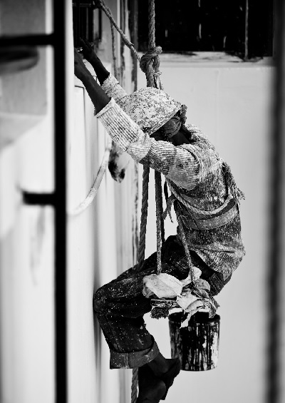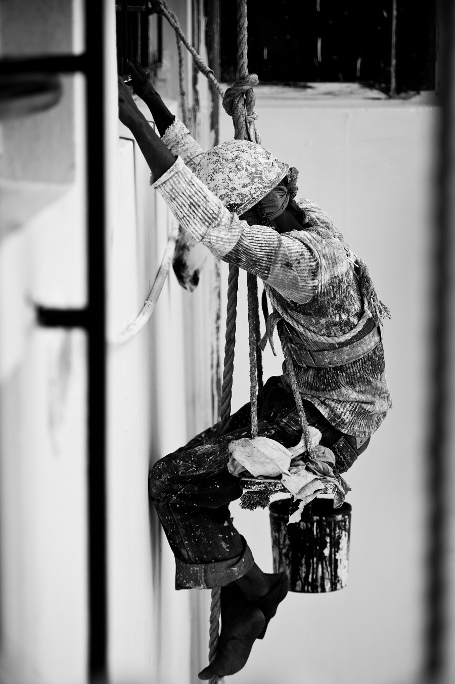 An man from the slums of India makes his living by doing the dangerous work of painting high-rise towers in Kolkata.