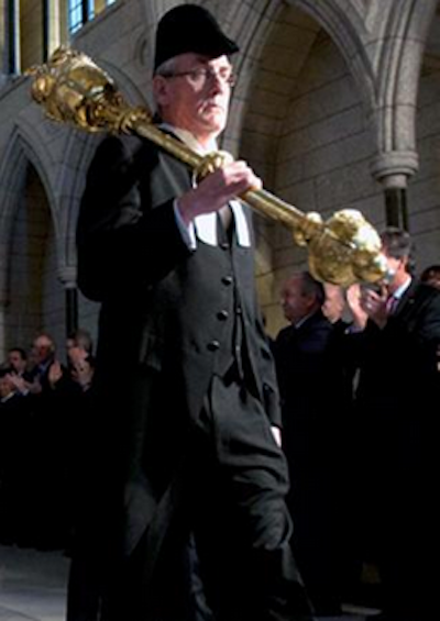 The Sergeant-at-Arms is the chief security officer of the Canadian House of Commons, appointed by the Governor General and the federal cabinet. The Sergeant does wear a fancy hat and robes and carries a large gold mace into the House at each session in a ceremonial parade. But appearances can be deceiving.