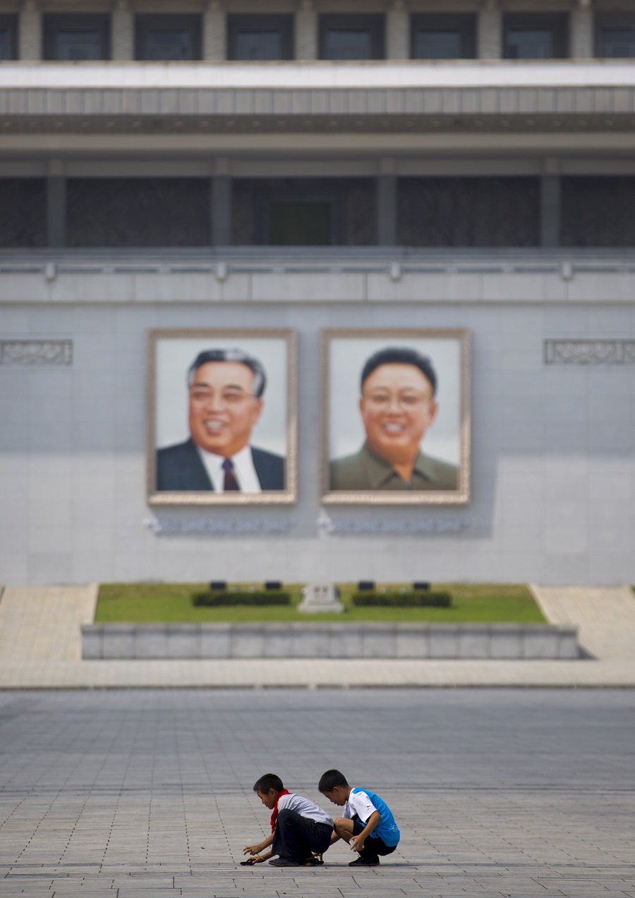 In his uncle’s house in Jung Pyong Ri village, beneath the portraits of North Korea’s first two leaders, Kim Il-sung, and his son, Kim Jong-il, a boy plays his guitar before going to school. He had stayed overnight in the house to play music with his twin cousins who live there