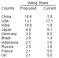 A key conceptual difference between using population and GDP measures to determine votes is simply this: GDP measures give the greatest weight to the countries that are economic powerhouses today.