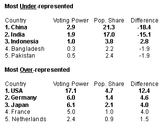 If each person is to have an equal say in the functions of the IMF, each country would receive votes according to its population. By that measure, China — with 21% of the world’s population — is under-represented by 18 percentage points, followed closely by India (15 percentage points).