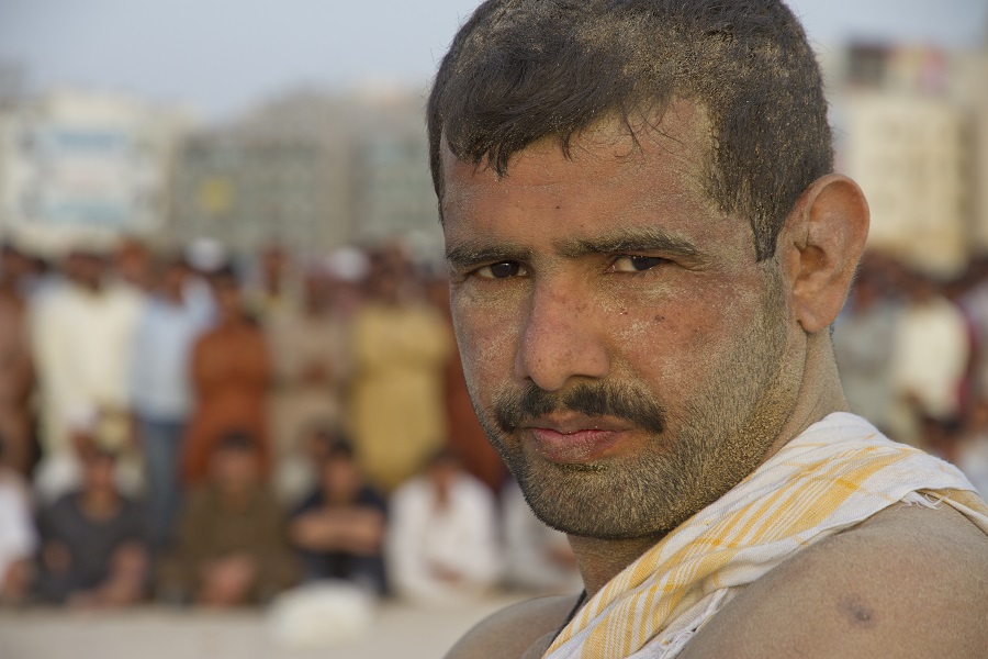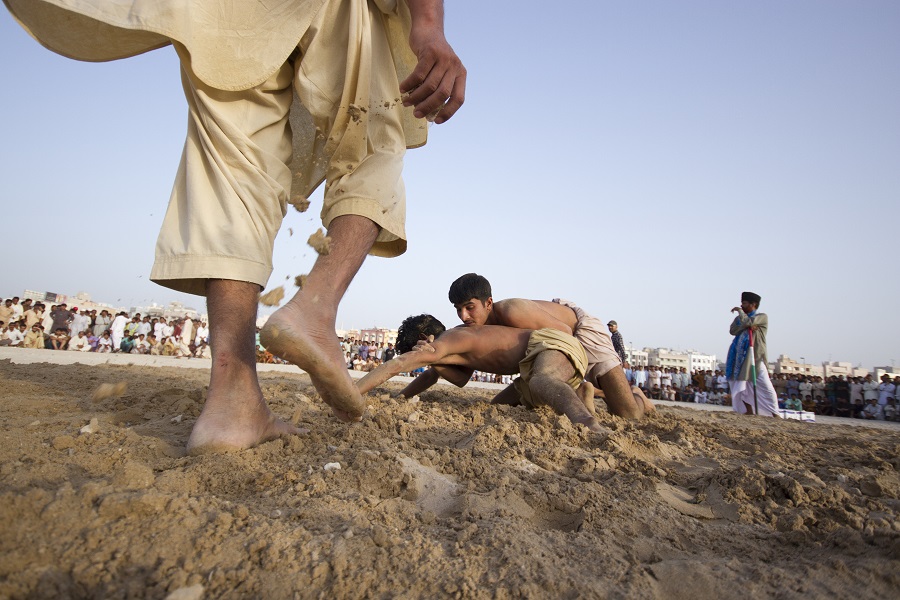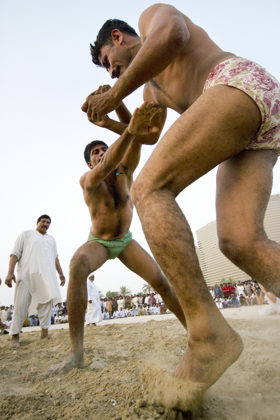 As the working day comes to an end, workers in Dubai congregate to enjoy a bout of wrestling in the sand.