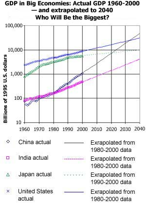 The chart projects China's economy growing at nearly 10% per year — and shows that it will become larger than the Japanese economy in less than two decades. On the same basis, it will become larger than the U.S. economy in about three decades. India’s economy will catch neither the United States nor Japan in this period.
