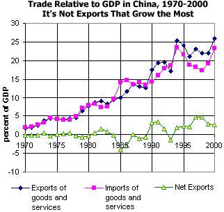While the graph below shows that this first assertion about China's growth is consistent, the latter proposition is not true. Yet, in the 1990s, exports expanded from 18% to 26% of China's GDP. But net exports showed no such trend relative to GDP. In fact, in 2000, they were near the decade-long average of below 3% of GDP.