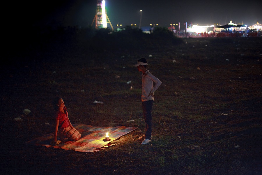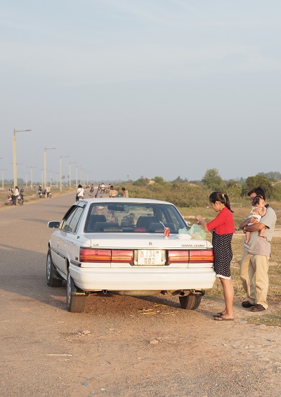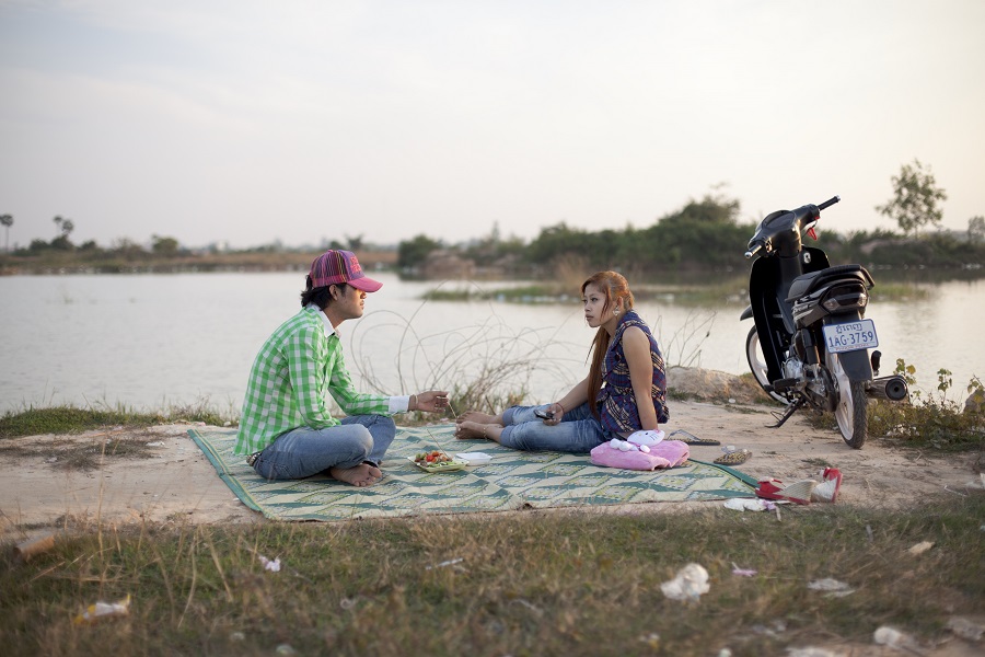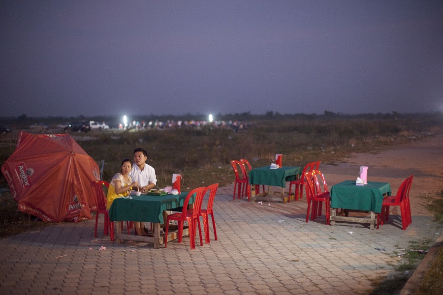 A young couple enjoy a picnic besides Plov Lek 60 Road on the outskirts of Siem Reap.